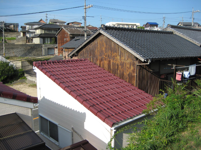 科学繊維では、雨や日にあたると劣化し強度が弱くなり割れやすくなるので、劣化しない鉱物のアスベストを使いました。(アスベストは、水と良く馴染み使いやすく、劣化しないし、安価なので、夢の繊維と言われた時代がありました。)